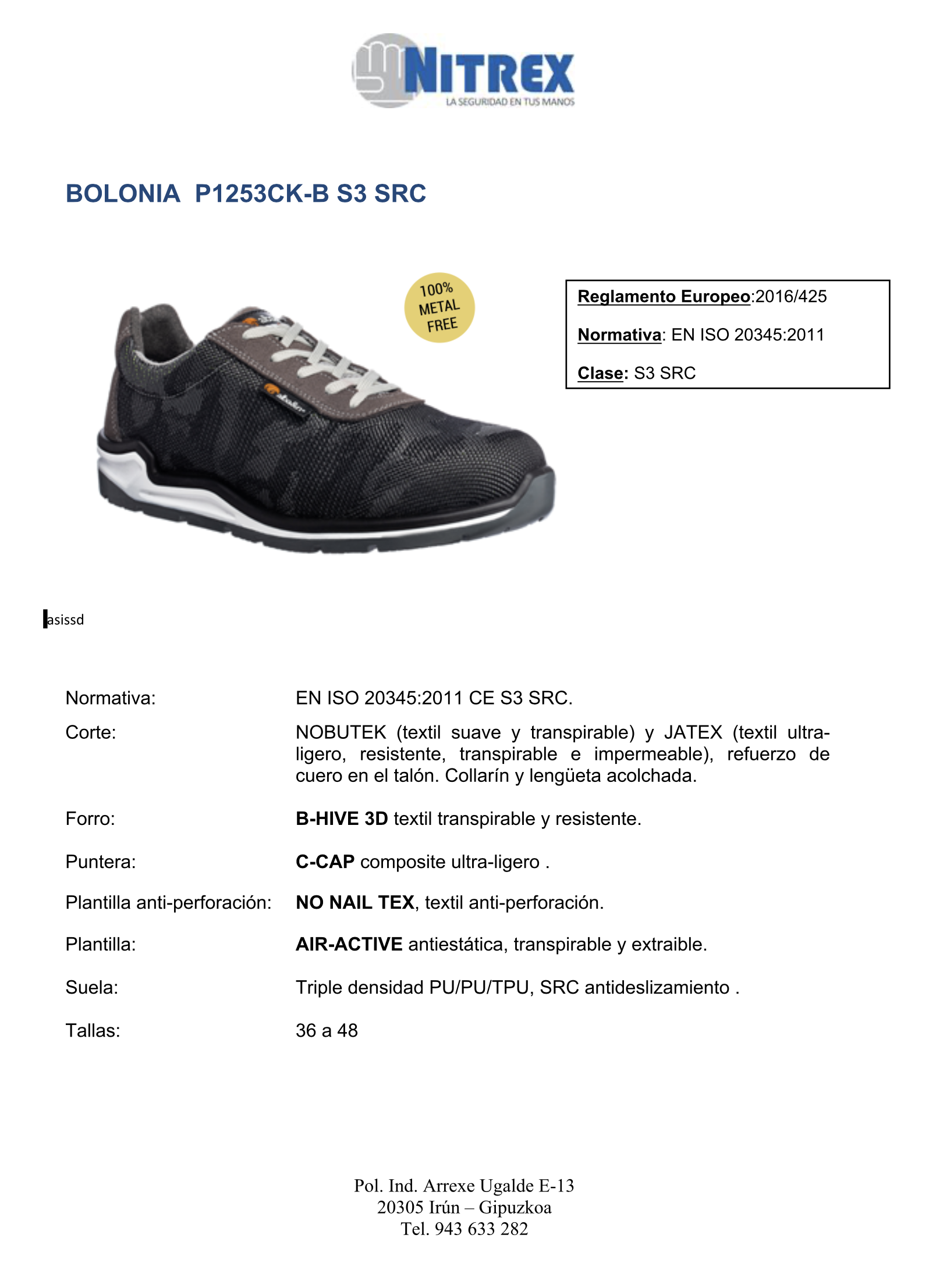 Zapatilla de seguriad con empeine de NOBUTEK (textil suave y transpirable) y JATEX (textil ultra-ligero, resistente, transpirable e impermeable), refuerzo de cuero en talón. Forro B-HIVE transpirable y resistente 3D textil. Puntera C-CAP, de Composite ultra-ligero. Plantilla antiperforación NO NAIL TEX, textil anti-perforación. Plantilla AIR-ACTIVE Anti-estática, transpirable y extraíble. Suela de triple densidad PU/PU/PU, SRC anti-deslizamiento